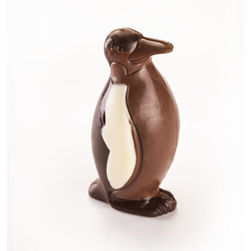 A milk chocolate hen filled with sugar-coated chocolate beans decorated in white and dark chocolate.